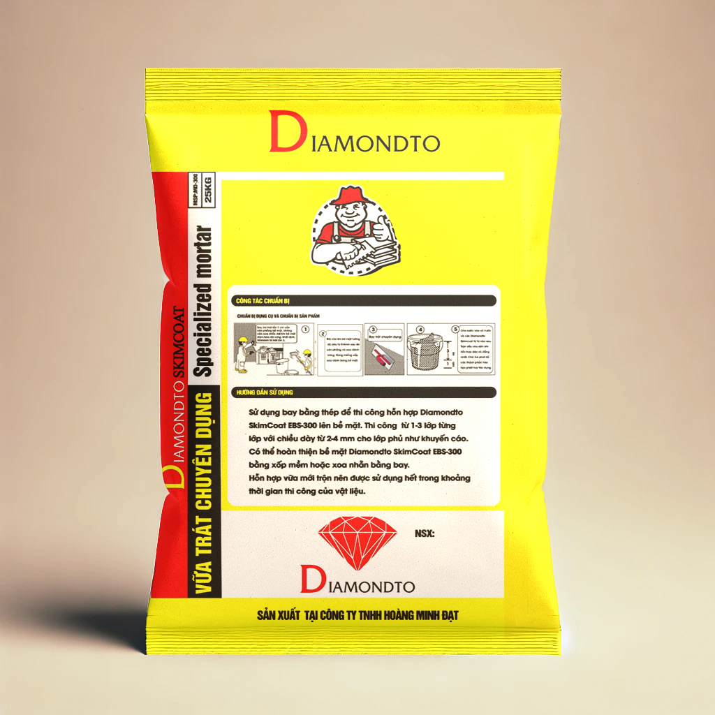 - Tỉ lệ trộn: Cho nước vào trước, vữa Diamondto SKIMCOAT đổ vào và trộn từ từ, trộn hỗn hợp nước và keo theo tỉ lệ 1/3 (1 nước 3 keo) .